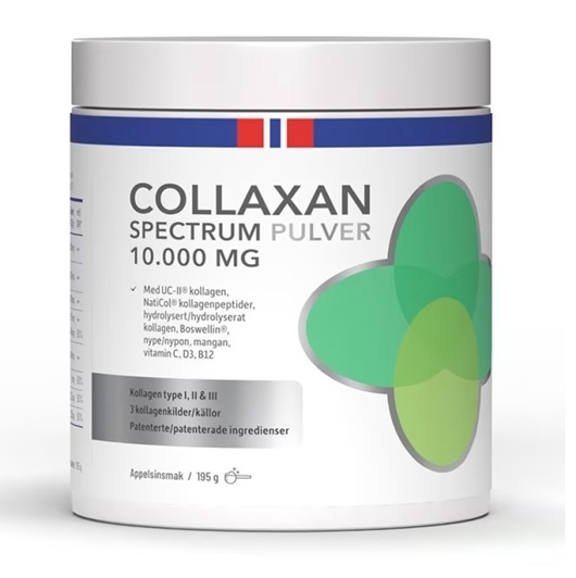 Ingredienser: Naticol® kollagenpeptider fra fisk, hydrolysert kollagenprotein fra storfe ≥ 93 % (inneholder svoveldioksid og sulfitter >10 mg/kg), aroma (naturlig appelsinsmak), sikorirot (Cichorium intybus L.) 90 % inulin, fruktpulver fra appelsin, søtstoff (isomaltulose), surhetsregulerende middel (sitronsyre), boswellia (Boswellia serrata Roxb.) gummiharpiksekstrakt, nype (Rosa canina) fruktekstrakt med 70 % vitamin C, UC-II® [udenaturert (naturlig) kollagen type II fra kylling/kyllingbrusk], søtstoff (steviolglykosider fra stevia), manganglukonat, fargestoff (riboflavin), kolekalsiferol (vitamin D3) og metylkobalamin (vitamin B12).