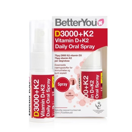Ingredienser: Vann, søtstoff (xylitol), emulgator (aksiegummi, solsikkelecitin), menaquinon 7 (vitamin K2), surhetsregulerende middel (sitronsyre), konserveringsmiddel (kaliumsorbat), aroma (naturlig peppermynteolje), kolekalciferol (vitamin D3), DL-tokoferylacetat (vitamin E).